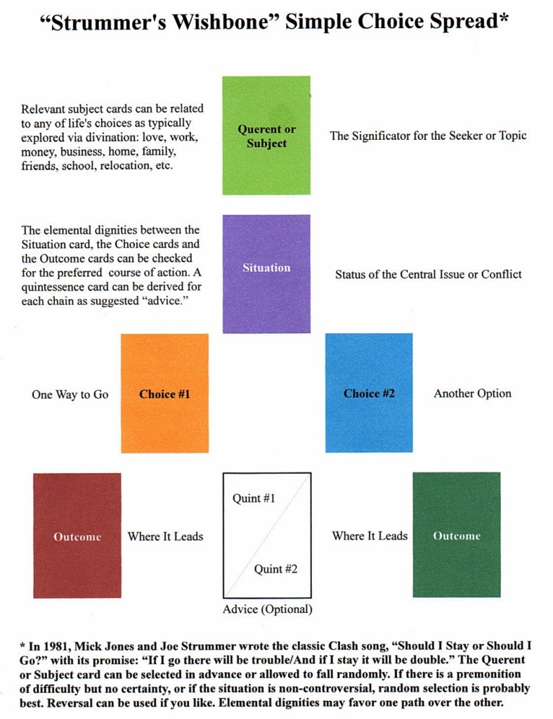 AUTHOR’S NOTE: Although the issue has already been settled in principle if not yet in fact, a client has reached a “tipping-point” in a major life decision and is seeking additional insight from an impartial Universe regarding the wisdom of a pending action that was chosen and is soon to be taken. I used my “Strummer’s Wishbone Simple Choice” spread for this reading.