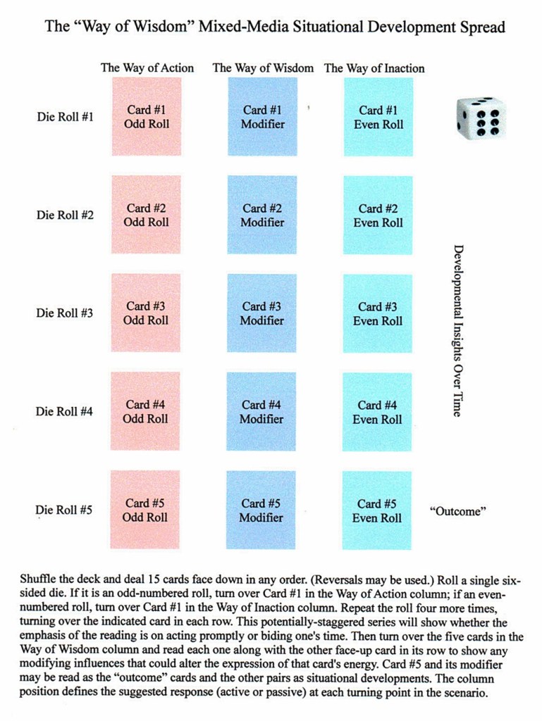 Here is a ten-card mixed-media (cards and dice) spread that can shift over time between action and inaction as the suggested “best” response to circumstances. Each of the five selected positions has a modifying card that can influence its expression (this is one of my few spreads that includes built-in auxiliary cards). The side-column that holds the most face-up cards will provide the advice on whether to act or refrain from acting over the course of the affair. Transitional turning-points in the matter can be decided in a number of ways: periodic changes over a predetermined period of time (five days, five weeks, etc); assumed or anticipated situational progress; a projected series of specific linked events; etc.
