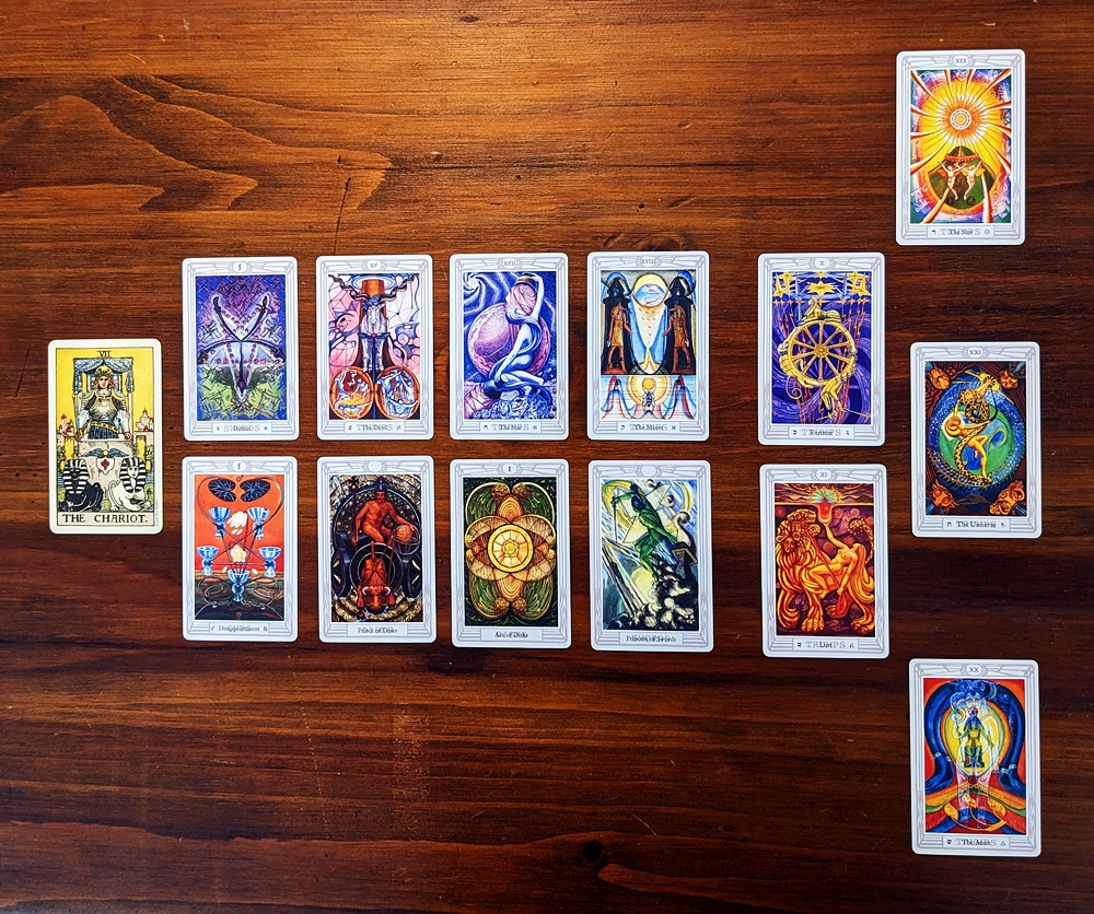But let’s see what the cards say. I asked “Who will win in the Russia-Ukraine war?” and used the Retro Thoth deck for the main reading and the “quintessence” cards, with the RWS Centennial Edition (in a tin) for the “Opportunity” card. It’s notable that, although I randomized thoroughly for reversals, all of the cards appeared upright, suggesting that there are few hidden factors in the situation at this juncture.