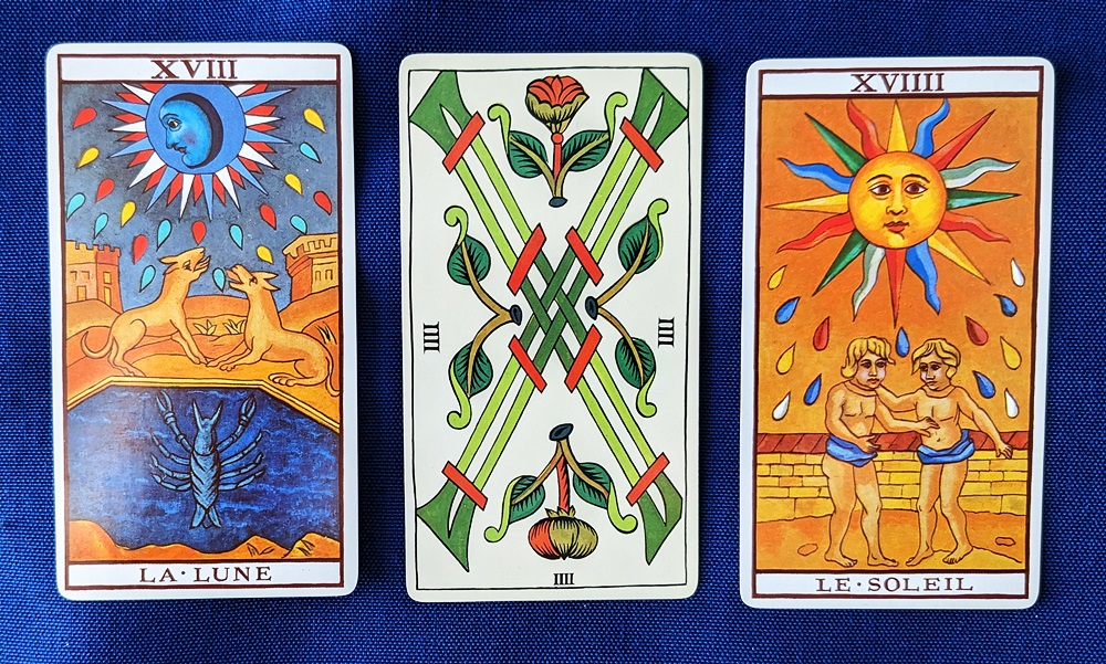 Jodorowsky notes that one must balance or harmonize the energies of the Sun and Moon in order to succeed in harnessing and commanding those forces. This concept is not dissimilar to the relationship between the Sun and Moon in natal astrology, in which the Ascendant is interwoven with them to produce the Arabic Part of Fortune and Part of Spirit, sensitive points derived from the shifting mathematical alignment between the three factors that denote a fourth meaningful parameter. In tarot terms, placing a third unknown quantity between two purposely chosen trumps can bring the abstract archetypes down to Earth in a pragmatic way, offering insights into how their frequently divergent objectives can be reconciled and anchored in mundane reality. Because the Moon as Water and the Sun as Fire are elementally uncooperative, it would be worthwhile to use Elemental Dignities in determining whether the middle card favors and reinforces one or the other, adding an additional layer of detail to the analysis. The goal is to explore whether the jarring dissonance can be transformed into an agreeable consonance (Jodorowsky’s harmonious “chord”) with the random middle card ideally serving as a fortuitous “bridge” between the two.