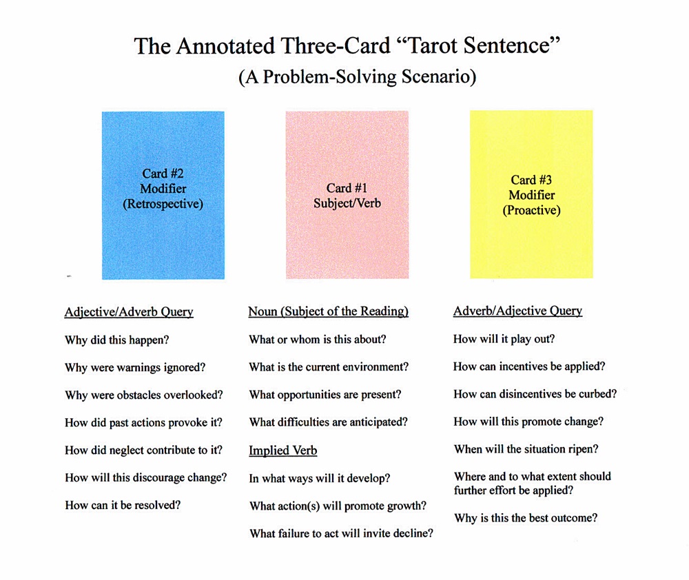 Generally, an adverb elaborates on the performance of an action by describing the “how, why, where or when” of its completion as well as its intensity, while an adjective provides insight on the quality of the event, which may shed light on the reasons for its occurrence and the extent of its applicability. For example, we could say “His speech is rapid” (adjective modifying the noun “speech”) or “He speaks rapidly” (adverb modifying the verb “speaks”). We could assume that the “verb” is subsumed under the middle card, which gives it a dual purpose: “What is this reading about and what is its developmental potential?” The “object” of the sentence could similarly be allotted to the card on the right as showing not only the “pull” of future considerations but also “where” the subject will land when the dust settles and the form it will take; the “when” of its arrival could be construed from the “time signature” of this card as well, which can be inferred from factors such as suit, number and inherent nature.