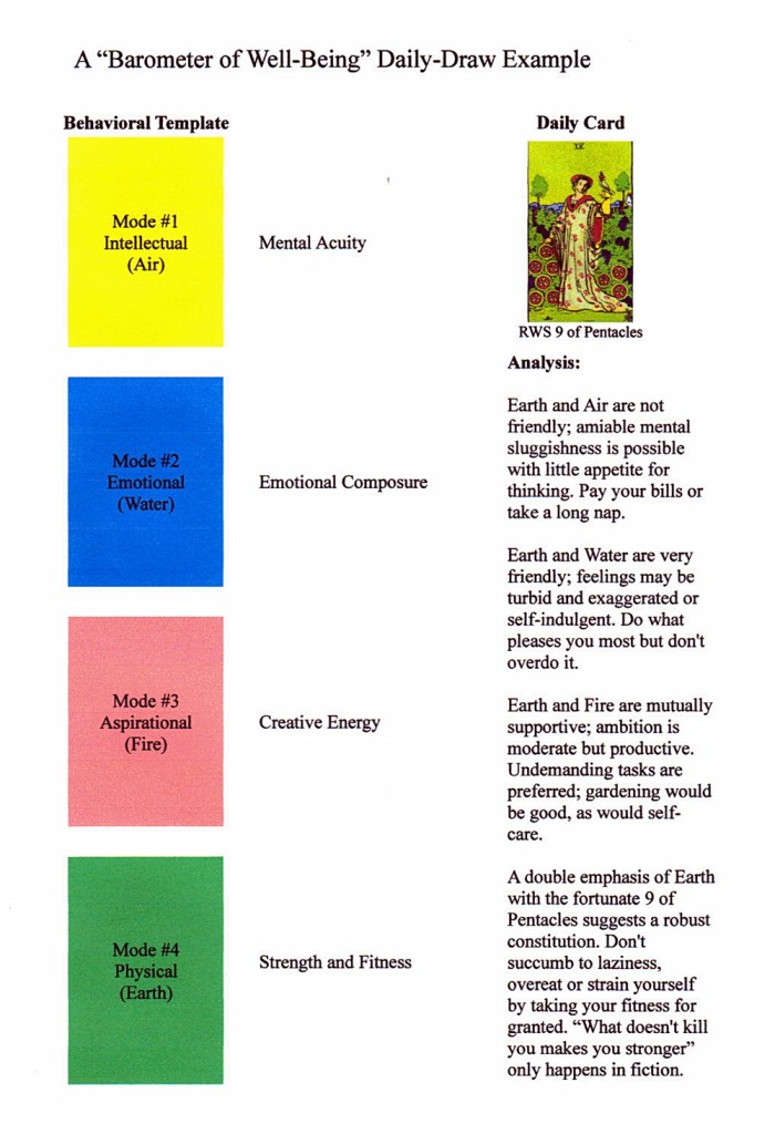 I then pull a single card and consider its qualities in relation to the underlying elemental nature of each area of life to determine how favorably or unfavorably they are aligned. If there is a significant mismatch I can place more emphasis on managing that area during the course of the day to “iron out the wrinkles.” If all scenarios are unremarkable, the “barometer” predicts “fair winds and smooth sailing.” Even when a traditionally difficult card portends diminished energy or challenging conditions, an affinity between the elements is usually advantageous and should permit riding lightly over any snags; while their visibility may be heightened, their “staying power” should be diluted, ultimately making them inconsequential in the hour-by-hour narrative. (This is my way of rationalizing the “bad card in a good setting” conundrum.)