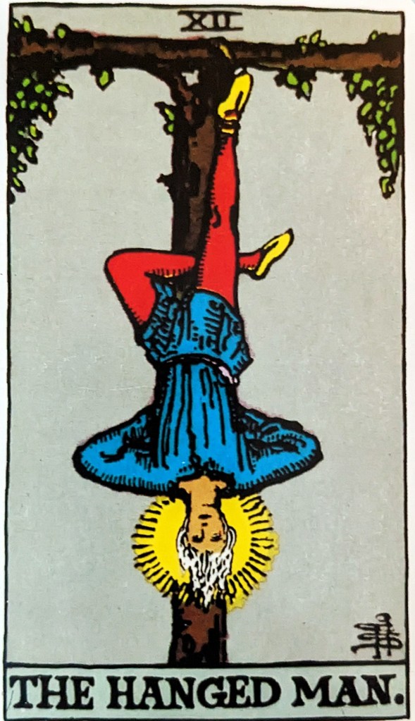 AUTHOR’S NOTE: This is a brief meditation on the Hanged Man. The title of the post comes from the halo around the head of the figure in the Waite-Smith version.