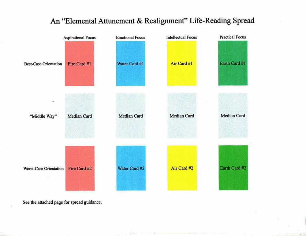 AUTHOR’S NOTE: I’m always looking for new ways to bring elemental attributes into tarot spread creation. This experimental layout uses both elemental attunement and midpoint numerology to arrive at an adjusted conclusion that does not end with a lopsided “best case” or “worst case” outlook but rather a compromise position that should ideally be more rational and achievable under the circumstances.