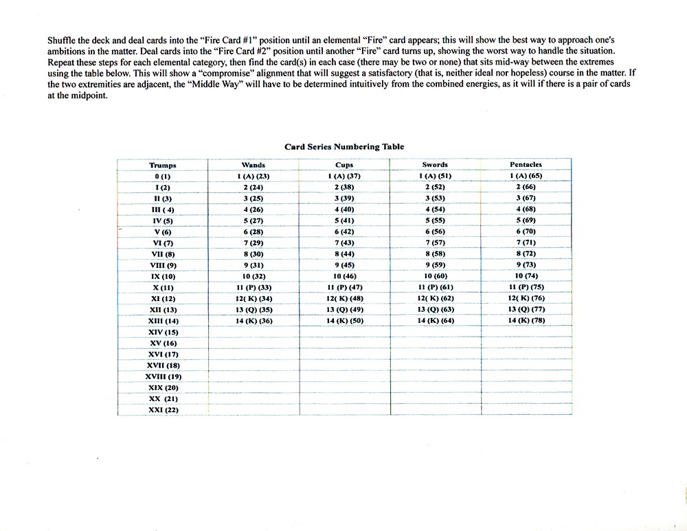 Only the “Middle Way” cards are read as advice for the querent since the other two can show exaggerated conditions that may be difficult to reconcile with the facts of the matter. Note that when a Major Arcanum and Minor Arcanum are drawn, the midpoint card will not necessarily be of the same element, which will add complexity to the interpretation. While this model creates a somewhat limited palette of interpretive options, in the majority of cases it stays on the “same page” elementally, reinforcing the central theme of each “Focus” area while exploring how two energies that are similar in quality but different in degree might be expressed in a single blended factor.