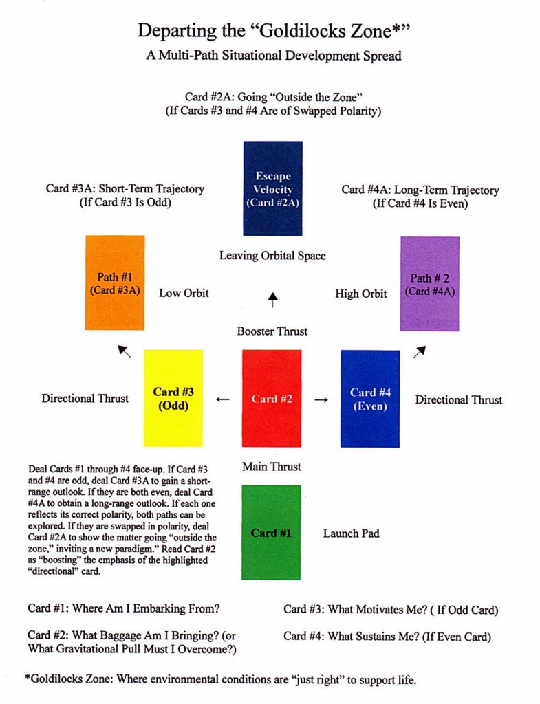AUTHOR’S NOTE: As a teenage science-fiction fan in the mid-60s I was fascinated by rocketry and the theory of space-flight in general. Here is a spread that uses some of that terminology to show three potential paths that a situational-development reading might take: short-range, long-range or open-ended. It will take some study for the user to figure this out, since it employs variations in odd and even polarity to determine which direction to pursue.