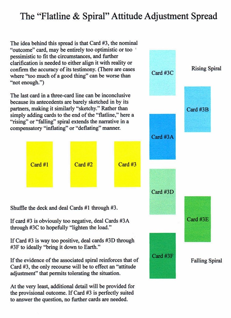 AUTHOR’S NOTE: Here is a spread for readers who have trouble making sense of vague or seemingly irrelevant answers from a three-card draw. It requests a “second opinion” from the cards when the outcome of the initial pull does not square with the relative significance of the situation. This is an instance of the “shape” of a spread – in this case a “flatline” trajectory and an ascending or descending spiral – having a lot to say about how it is applied. It uses a structured approach to clarifying cards that is intended to demystify or at least modulate what seem to be irreconcilable differences. Below the spread is an example reading from current affairs.