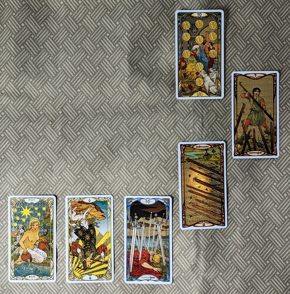 I asked the question “What will be the condition of the U.S. dollar in world financial markets over the next six months?” I used the Golden Art Nouveau tarot with reversals.