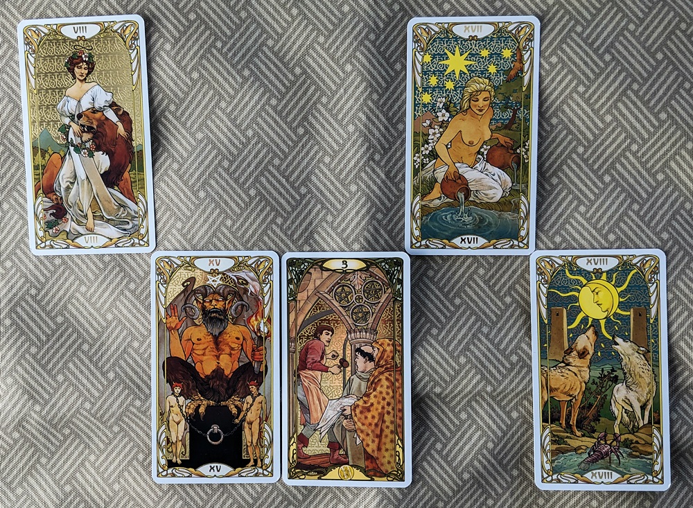 AUTHOR’S NOTE: Since I’m working with the Waite-Smith deck and not my preferred Thoth in these “numerological counterpart” exercises, I’m treating Strength as the eighth trump and pairing it with the Star (17=1+7=8) because I’ve already written about Justice as “11” (or 1+1=2) and equated it with the High Priestess. My customary approach is to envision Strength (aka Force or Fortitude) as the eleventh trump and Justice as the eighth one.