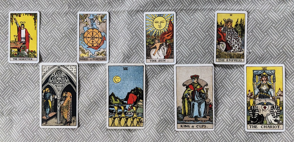 *Note that in my personal approach to the quintessence calculation I treat the Kings as “14.” If the King of Cups is left as unnumbered, the “quint” card becomes “11” (3+8=11), or Justice in the RWS deck. This works just as well for delivering the seeker’s “just desserts” as promised by the Wheel of Fortune, although it is a little more ambiguous.