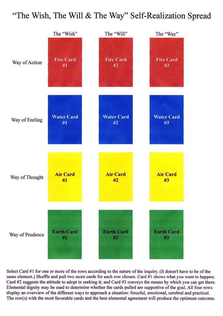 Here is a deceptively simple spread that permits the reader to examine four different approaches to a situation either singly or collectively: the Way of Action (forceful); the Way of Feeling (emotional); the Way of Thought (cerebral) and the Way of Prudence (practical). There are no specific “outcome” cards, just those that show the means to an end. The row(s) with the most fortunate series of cards should be considered the “advice” scenario. Conversely, the least favorable row(s) can be read as cautionary.