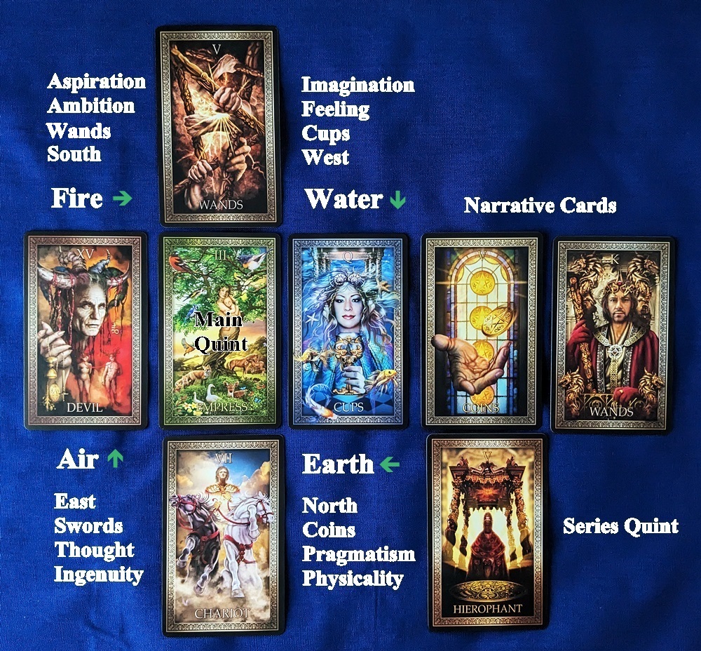 A further wrinkle is to calculate a “quintessence” card for both the original four-card pull and for the extended three-card forecast(s). The first “quint” (they are always Major Arcana cards) will reflect significant “big picture” factors that effect the entire reading and should be placed at the center of the layout, while the second will imply the long-term consequences of the matter as shown by the three-card “radial” expansion; it should be placed at the end of that line. Below is a brief example reading demonstrating its use. For the purpose of illustration, I did not introduce reversed cards and I placed the “Series Quint” below the narrative line.
