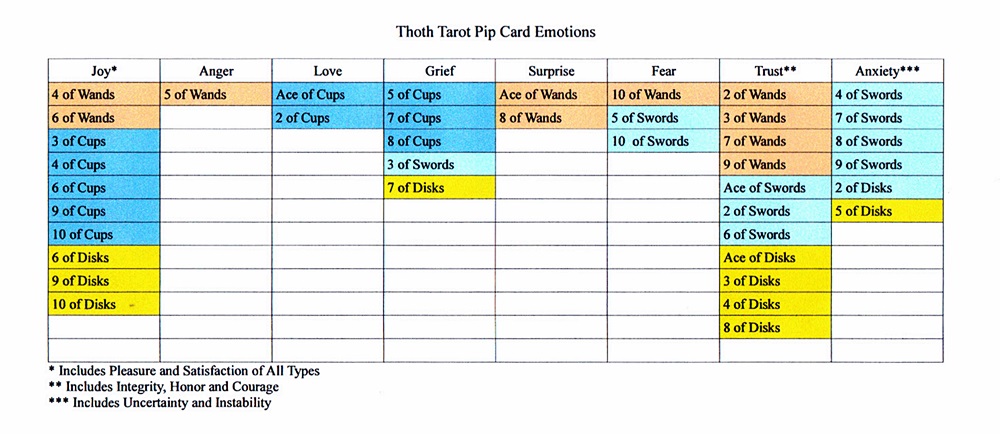 As I’ve said before, I don’t favor the tarot as a technique for “psychological profiling” since it is too casually impressionistic to be precise in its renderings (unlike natal astrology, which is perfect for that purpose). But I did once participate in a challenge to equate the Minor Arcana to a range of common human emotions, and this seemed like a good place to look for any “mapping” potential. This exercise used the Thoth deck because – unlike the RWS deck – it presents no “canned narrative vignettes” to complicate and confuse the issue.