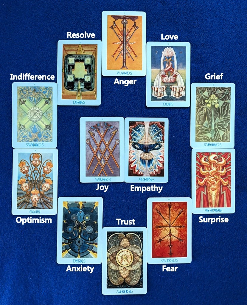 I will work with this table by selecting the card from each column that is most expressive of the key emotion and assemble the group into a template that can serve as a framework for examining an individual’s mental/emotional inclinations and, and by extension, probable intentions in a specific matter of interest. Here is my cut at a concise list, which balances the four elements at three each. Note that the top eight emotions comprise what we were given to work with, while the other four represent my attempt to expand the palette.