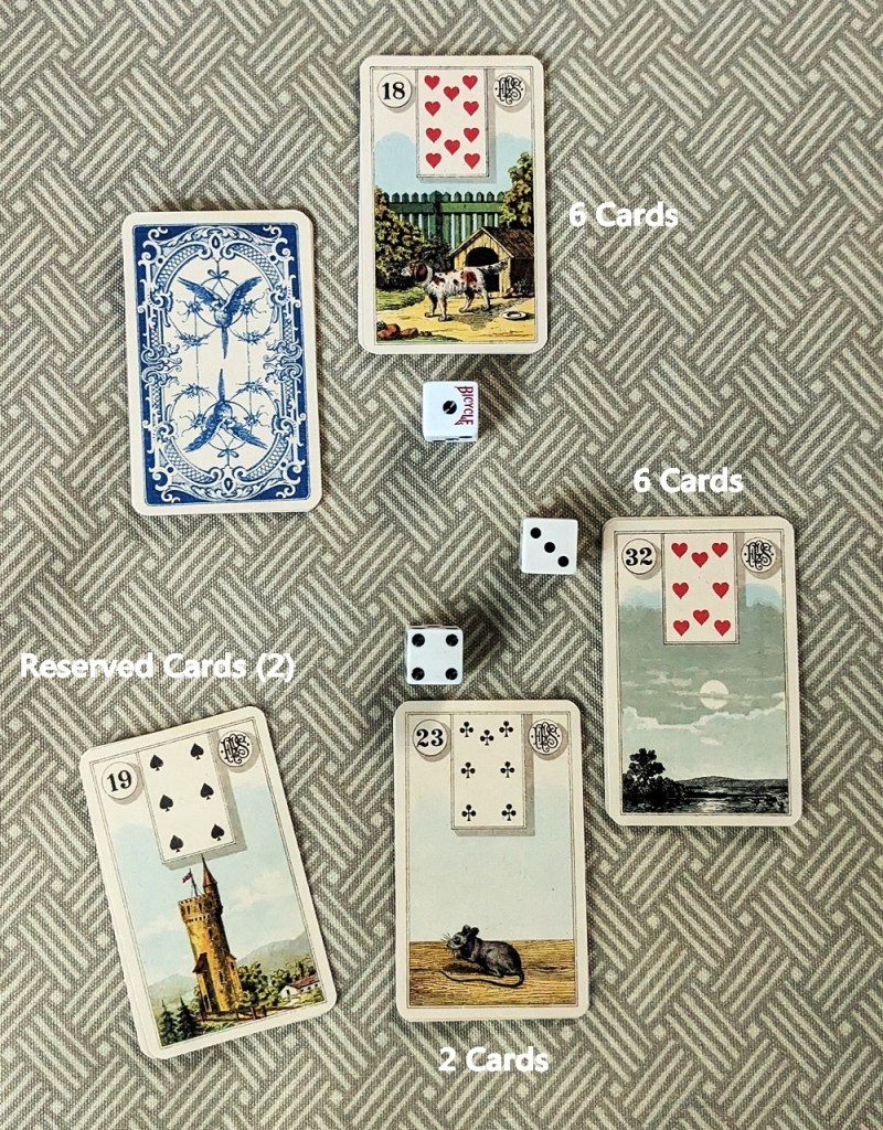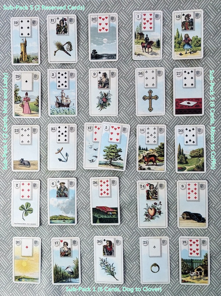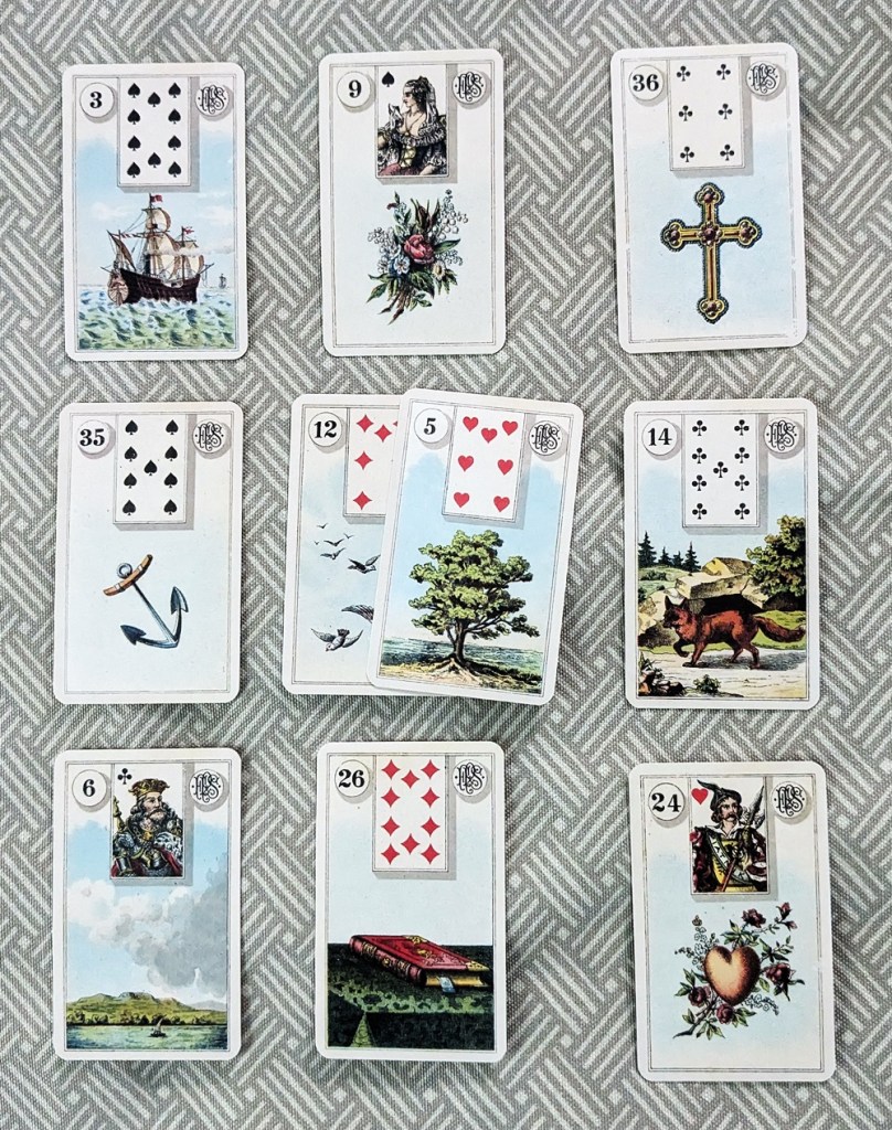 AUTHOR’S NOTE: To my knowledge, between the 9-card, 3×3 “box” and the 36-card Grand Tableau there is only one non-linear layout, the 15-card, 5×3 mini-tableau (although the 21-card, 7×3 Gypsy spread might qualify). Here is an unconventional attempt to fill that void using the 36-card deck and a single six-sided die as a pointer. It creates a build-it-as-you-go 25-card tableau with a 26th “covering” card to double-up on the central focus card for reasons I’ll explain later. (The inspiration for the design came from my recent Mandala of Revealing tarot spread. All images are from the Grand Tableau Lenormand, copyright of Lo Scarabeo, Torino, Italy.)