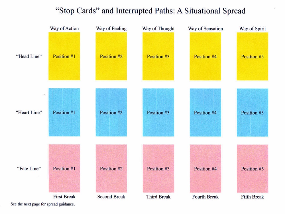 By giving these so-called “stop cards” a unique role, my objective here is to narrow and shape the focus of any reading in which only certain modes of response (action, feeling, thought, sensation and spirit) are critical to the querent’s success in the matter. In practice, it will be possible to wind up with just one fully-populated column and therefore have only a single three-card set to read. (At worst, the deal could deliver three “stop cards” in the Way of Action column, indicating that no good will come of continuing the reading.)
