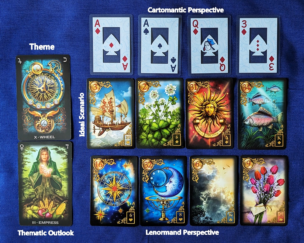 AUTHOR’S NOTE: In the past I have occasionally dabbled in two-phase readings using cards from different disciplines in a single spread, usually tarot and Lenormand or an oracle deck. As I spend more time and effort looking into traditional cartomancy while exploring the Lenormand playing-card insets, I decided to refresh my approach.