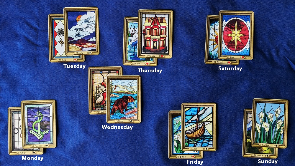 It employs a pair of cards for each 24-hour period, a polarized “base” card that describes the overarching theme for the day and a “covering” card of any polarity that suggests how the background influence might play out in “real-time.” Some Lenormand readers prefer to take the cards only in sets of three, which is certainly suitable for this spread but I submit that it may be overthinking because we’re dealing with temporary circumstances that can and will change on a daily basis. Two cards taken as potentially countervailing emphases seems just right for the light touch usually accorded a daily draw.