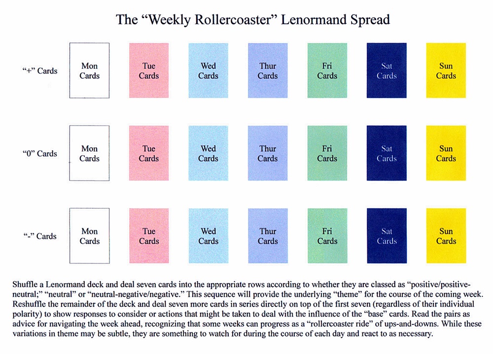 AUTHOR’S NOTE: There is an ongoing discussion on one of the Lenormand sites regarding which spread is best for both short-range and long-range readings. The consensus is that the 36-card Grand Tableau will work just fine for all purposes, including single-subject queries. My personal opinion as a big fan of the GT is that it is most practical for life-reading scenarios that include multiple theme cards, and that the 9-card “box” is better for short-to-mid-range forecasts and narrowly-framed questions. However, this inspired me to create a custom spread for weekly (that is, seven “linked” daily) readings that can be merged to cover a month. The test pull below is a perfect example of the up-and-down nature of this spread, in which each day is not necessarily of the same complexion as the previous one due to the positive, neutral or negative quality of the cards involved.*