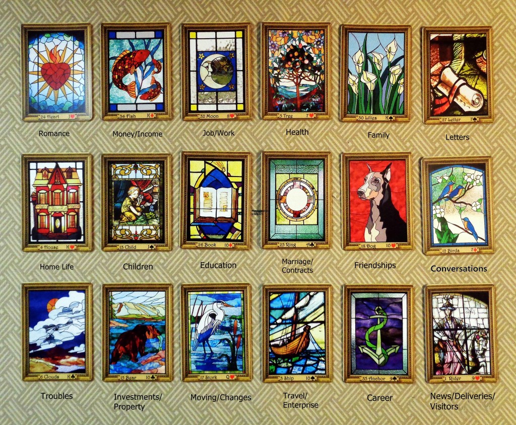 AUTHOR’S NOTE: I’ve always viewed the Lenormand Grand Tableau as a “long-range, big-picture” spread that can address any and all questions in a single pass over a 6-12 month period, but in online discussions I see that many people use it for shorter-duration readings of a more focused nature. I already do a monthly New Moon tarot reading, and I’m thinking that if I structure it properly a monthly Grand Tableau would be just as revealing while not amounting to “overkill.”