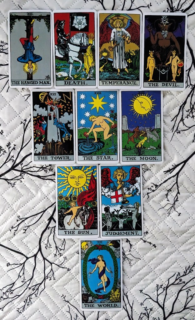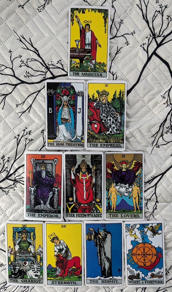 I decided to lay out two sets of the Major Arcana in a pair of triangles, one ascending and the other descending (together forming a diamond), to see whether I might acquire any insights from the arrangement. The first group ran from One (the Magician) to Ten (the Wheel of Fortune), while the second one encompassed Twelve (the Hanged Man) through Twenty-one (the World). Each of these patterns contains nine internal triangles or triplets that contribute to the analysis. I removed the Fool as being of null value, and created a separate layout for Justice because it serves as the pivotal card between the two series. (All images are from the Albano-Waite Tarot, copyright of US Games Systems Inc, Stamford, CT.)