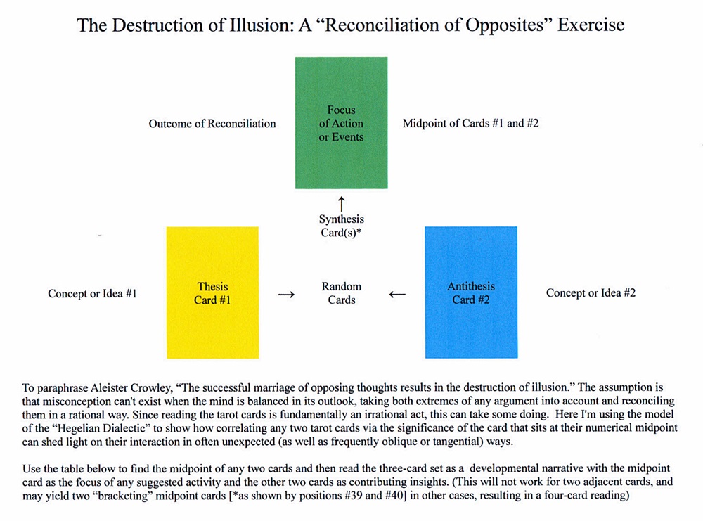 As an exercise, any two cards from the table below (except two adjacent cards) can be selected and the card that sits at the numerical midpoint between them can be applied as a synthesizing factor (this is a philosophical meditation that may take some inspired thinking). In an actual reading, the “Thesis” and the “Antithesis” cards will be randomly drawn and may not actually be opposite in nature, but the principle of finding and interpreting their confluence is the same. The midpoint card can imply a figurative “handshake” between them, which can indicate either concord or an intent to “agree to disagree” depending on the measure of cooperation between the three cards. (Note that in some cases the midpoint will “bridge” two cards, and both should be blended into a compound conclusion.)