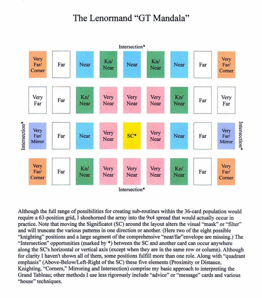 Here I’ve placed the “mandala” within the standard 9×4 Grand Tableau layout, which means that not all of the sub-routines are fully populated; the complete mandala contains a possible 63 positions (9×7), of which only 36 can be populated in an actual reading. (Note that “Kn” means “knighting,” a way to link the Significator to various other cards using the famous “chess move.”