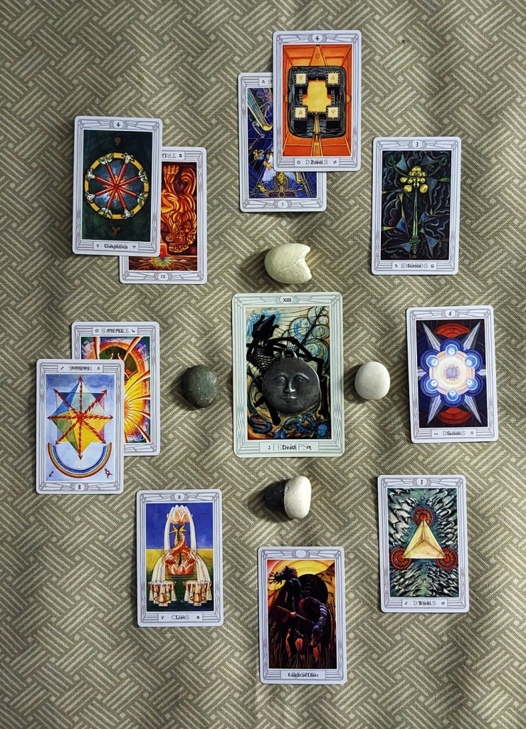 This month is unique in that I received three Major Arcana cards among the eight positions. My current practice is to treat trump cards as establishing the “background theme” for their period of influence, and then pull another card to describe its more pragmatic dimensions; this month I was fortunate to draw a mundane Minor Arcana card in each case, making the interpretation more straightforward. In addition, I derived a monthly focus card from the digits for the day of the New Moon using numerological reduction (11/13/2023, reducing to 13, Death). I quite often get Death in these instances, and it is the card representing my astrological Ascendant so it feels like an old friend. I’m not anticipating any radical changes this month, so it’s just another “environmental theme” card implying an atmosphere that is suitable for significant transformation (without actually setting it in motion).