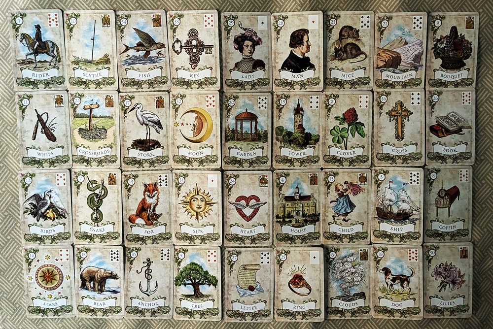 AUTHOR’S NOTE: For my New Moon forecast this month I’m doing both my normal monthly reading with the tarot and a Lenormand Grand Tableau overview to get a different perspective on the next four weeks. (I need more practice with the GT.)