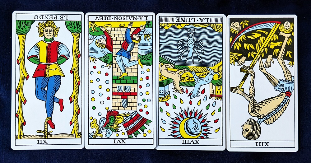 There are two trump cards that abundantly demonstrate the “heads-up” phenomenon, the Hanged Man and the Tower, and two more (the Moon and Death) that put a “heads-down” spin on it.