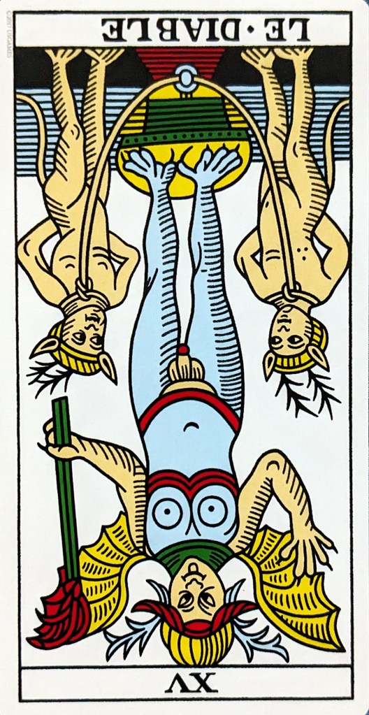 Regarding the Tower, I once had a conversation about its reversal with someone who was amused by the notion that the falling figures might be seen as “flying back up into the windows.” I agreed with him that this is nonsensical, but it appears to me that they might well land on there feet rather than on their heads and walk away relatively unscathed (with lightning underfoot, we can only hope they will land on terra firma and not in scalding quicksand). Despite Alejandro Jodorowsky’s insistence that the appearance of the Tower offers a cause to celebrate, I’m thinking that its reversal is more about surviving the debacle with poise and dignity. In both instances, rather than dashing their heads into the ground, the figures are able to hold them up out of harm’s way.
