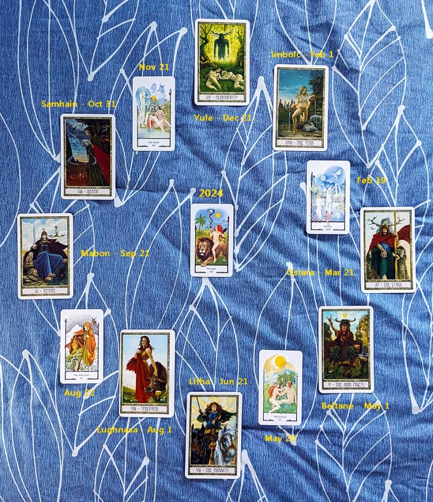 AUTHOR’S NOTE: For the next solar cycle, I chose not to pull random cards to represent the Celtic year, but rather to use the tarot trump cards associated with the eight Celtic holidays and the four zodiacal ingress dates for the Sun, thus creating a universal layout with slightly more irregular sequencing than the typical twelve-month zodiacal pattern. (I decided to stay with the astrological correspondences for Strength and Justice.) The Card of the Year at the center is based on the numerological reduction of “2024.”