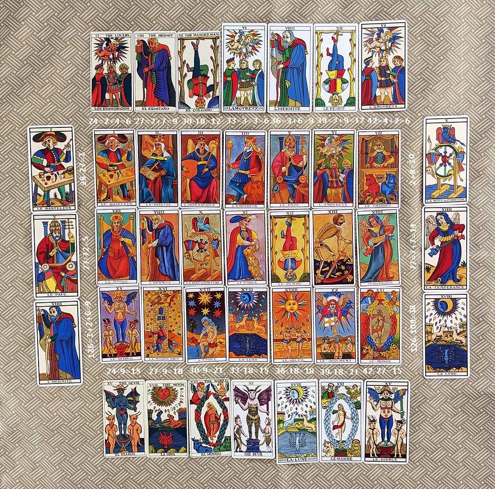 The first thing that jumped out at me was the repetition of the numbers 6 (the Lover) and 15 (the Devil) thrice when totaling the values of the vertical sets; these cards already share a common root since 1+5=6, although in practice they are seldom mentioned in the same breath. The second thing was the triple appearance of the Hermit and the Moon (also numerological counterparts since 1+8=9), twice in the columns and once in the rows. Finally, the Hanged Man and the World (linked by casting out nines) show up twice in the remaining columns.