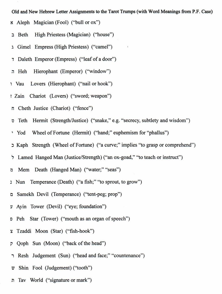 AUTHOR’S NOTE: I’ve known for some time that those who prefer classical decks like the Tarot de Marseille to the esoteric reveries of the post-Occult Revival don’t subscribe to the conflation of Hebrew letters and trump cards in general, and particularly not to the model proposed by the Hermetic Order of the Golden Dawn. Rather than rejecting the concept out-of-hand, here I’ve put together a “rectified” sequence that reinstates the prototype of the Continental masters.