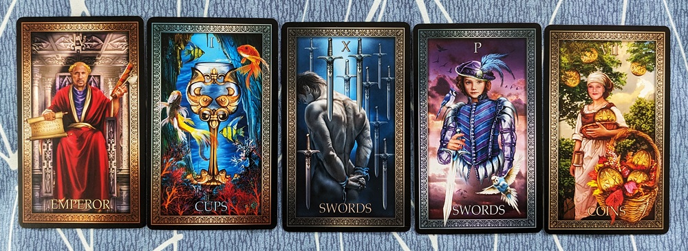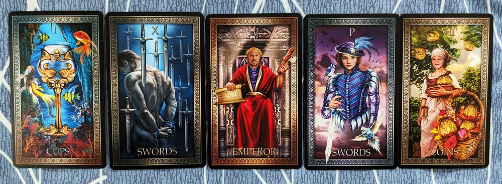 The initial reading suggests that unbridled optimism (Ace of Cups) will run head-on into harsh reality (10 of Swords) that eviscerates any unwarranted self-confidence (Emperor), resulting in a retreat into callow pretense (Page of Swords) and “success unfulfilled” (7 of Coins).