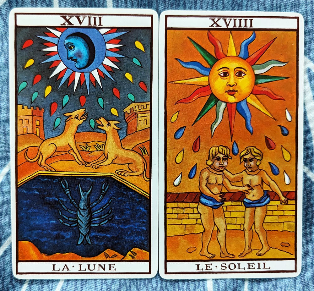 Much has been written about the comma-shaped symbols appearing on both the Moon and Sun cards of the Tarot de Marseille. Later authors have often explained them as “Yods” after the Hebrew letter associated with the masculine principle of insemination (think “sperm”) while others with a mystical bent have called them” “drops of blood” that express the material coalescence of spiritual being. The interesting thing is that – at least in the Conver TdM – there are 19 of them in the Moon card and 13 in the Sun’s image, neither of which aligns with any established occult system of my acquaintance (lending credibility to the tarot historian’s insistence that the TdM is not an esoteric deck and its compositions are allegorical rather than metaphysical). But of course nobody knows the mind of its creator.