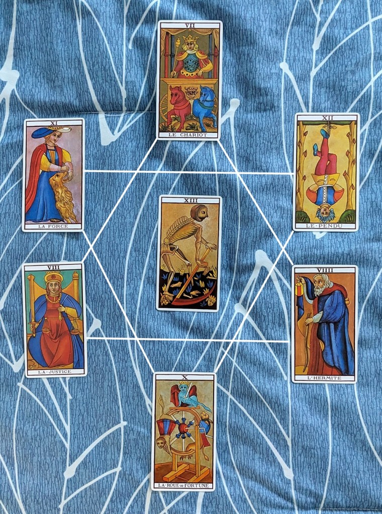 In the second septenary, the “namless Arcanum,” XIII, with its emphasis on severing ties, also has connotations of advancing to another level. This set is “passive,” depicting the initial Heh of Tetragrammaton, and has a connection to the number Two. The key cards are VII, X and XIII.