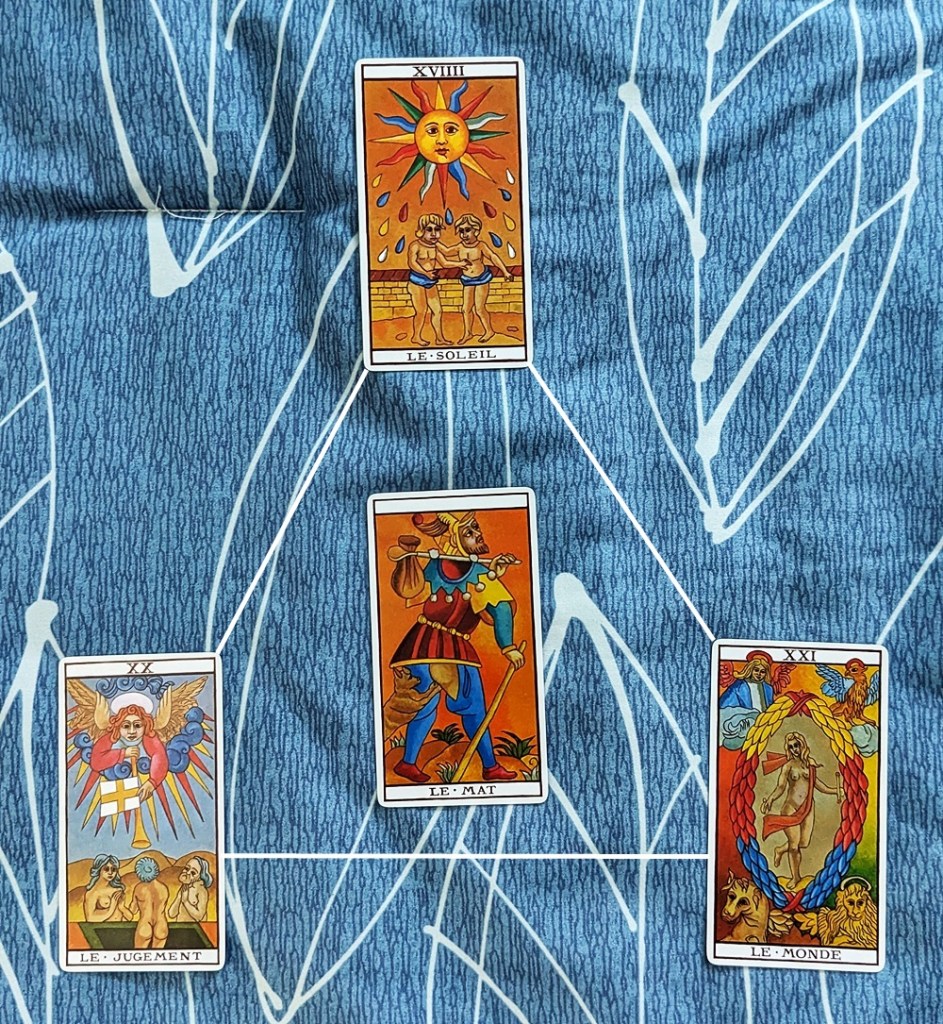 The last set of four cards – actually “3+1” – concludes with the unnumbered Fool, which Papus equates to zero (although he says it “ought to correctly bear the number 22”). This ternary represents the number Four and the “Heh Final” of Tetragrammaton. It establishes the “connection between the major and minor arcana” per Papus, who terms it “passage from the creative and providential world to the created world of destiny.” He observes that the encapsulated Fool in the center is the key “transitional” card, in that it “closes the tarot by a marvelous figure, which represents its constitution to those who can understand it;” in other words, it synthesizes the whole of the tarot’s substance as expressed in the trumps. It subsumes the essence of the three cards that surround it as well as that of all 21 cards that precede it, reminding me of the “Cosmic Egg” of 19th-Century occultists (re. the Golden Dawn and, later, Aleister Crowley in The Book of Thoth). The triangular group is suggestive of an incubator, so there appears to be a “hatching” in the future.