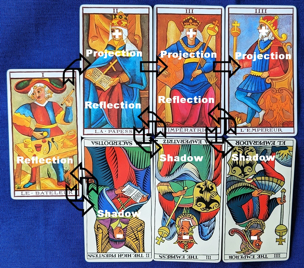 Below is a graphical presentation of the model using the first four trumps; the rest of the quaternaries shown in my earlier post will follow suit). The active role is depicted by the upright card of the Fournier Tarot de Marseille in the top row and the passive role is displayed by the reversed card of the Fournier Spanish Tarot below as a “mirror” of the card to the upper-left of it. This creates a reciprocal flow (shown by the arrows) that can indicate a range of incomplete or unfulfilled actions, one of the standard meanings of reversal. In each case, the respective role is played out in accordance with the card ahead of it (to the right) or the card behind it (to the left). The active mode projects its shadow ahead and the passive mode sits in the shadow of the one behind.