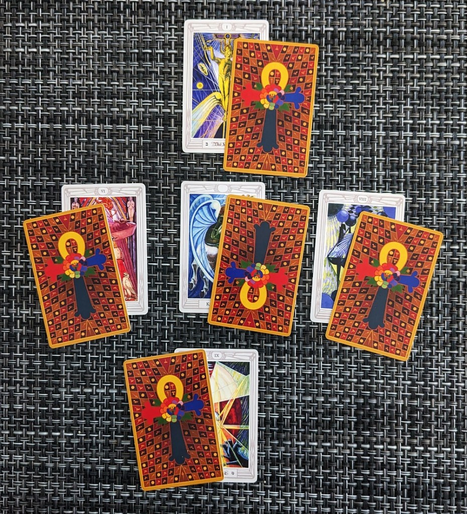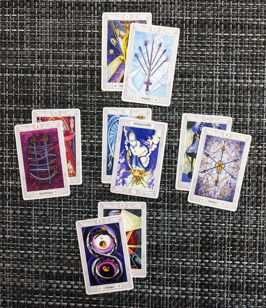 I shuffled the pip cards, again allowing for reversals although none appeared in this step, and dealt four of them on top of the trump cards to show the “processes” by which the overarching “principles” of the trumps will be implemented. My first thought on seeing the outcome below was “This guy can’t get a break!” Three of the four pips are Swords, the two most difficult of which previously appeared in the dissolution stage, implying that he is still “at sea” when it comes to pulling himself together. But at least they’re in their own element here so he should finally be able to get his head around them. The 7 of Swords (Futility) and the 8 of Swords (Interference) indicate disruptive mental turmoil that deranges his point of view (he still needs to gain some distance from his anxiety), but the serenely rational 6 of Swords is once again his salvation. On the other hand, the 2 of Disks (Change) as the pragmatic result of his deliberation suggests that the Hermit has no solid ground to stand on, so the individual should not be too sure of his footing. He needs to make the best use he can of Aleister Crowley’s formula “Change equals stability; stability equals change” if he is going to land on his feet.