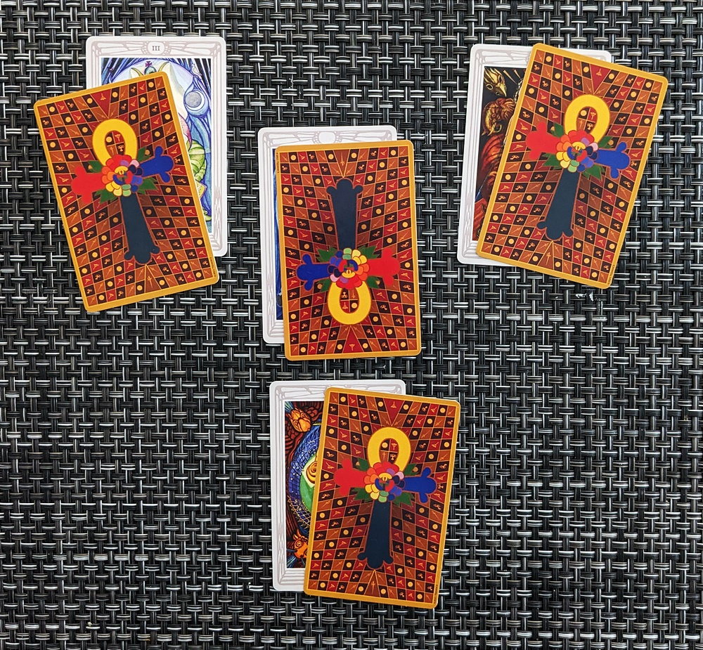 To emulate the principle of coagulation with the Major Arcana of the tarot, I chose what might be considered the three most malleable of the Earth trumps: the Empress as Venus; the Hierophant as Taurus (the docile sign ruled by Venus) and the World, with its double correspondence of ductile Earth and form-building Saturn, the planet of solidification and structure. I placed these cards in an inverted equilateral triangle pattern with the World at the down-turned apex to suggest materialization. (In the image below, the face-down cards are placeholders showing the architecture of the fully-populated layout.)