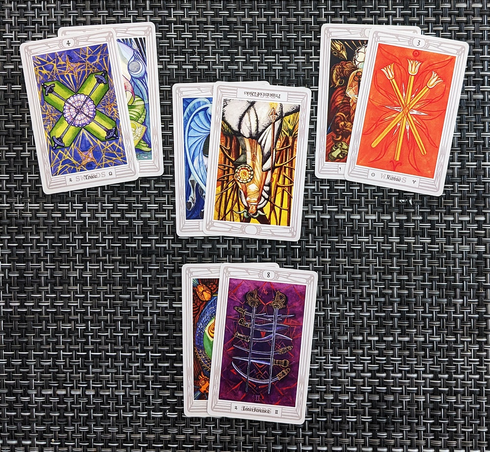 I separated the pip cards from the deck, shuffled them and dealt three cards on top of the trump cards in the order Empress-Hierophant-World to show the mundane “processes” by which the archetypal “principles” can be applied to the act of coagulation in the individual’s quest for perfection. He received the 4 of Swords (Truce); the 3 of Wands (Virtue); and the 8 of Swords (Interference).