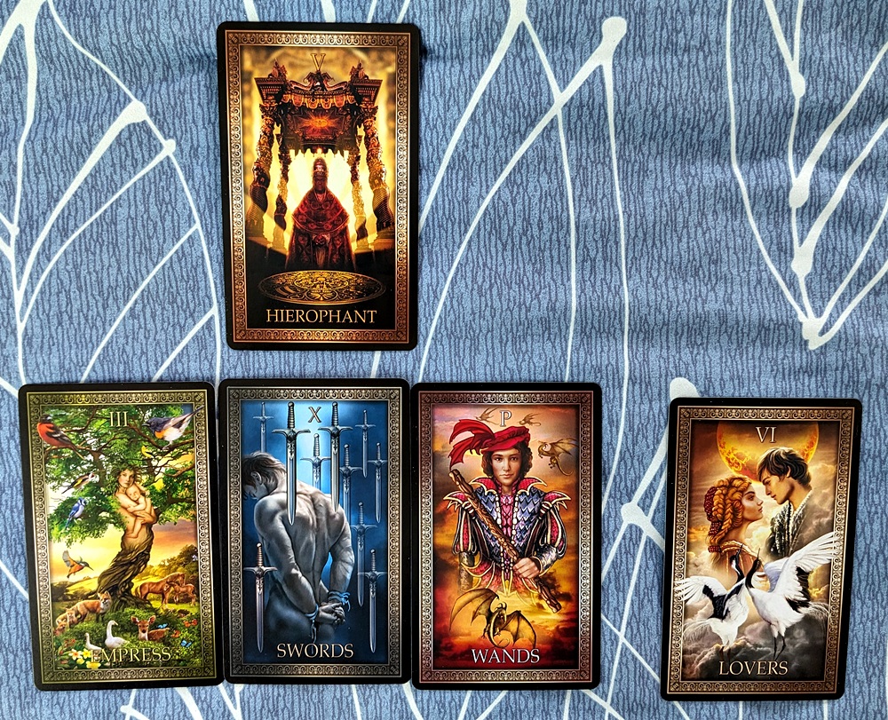 The “snapshot” synopsis of the story-line was “If I’m going to avoid running afoul of Mother Nature (Empress), I better stay light on my feet (Page of Wands) to “ride the lightning” (10 of Swords).” The 10 of Swords suggested some kind of trouble, possibly with my snowblower that hasn’t been “tested in combat” yet this winter, and since the earthy Hierophant is elementally hostile to the airy Swords card, I was thinking it might jam up with snow like it did last winter even though I adjusted it over the summer. The Page of Wands implied that I’d better prepare to expend the energy and get out the snow shovel. The Lovers as “quint” card made me think I would be enlisting the local plow guy to clear the driveway (he is “on-call” in a standby status), although I would prefer not to have to do that since the Hierophant is also elementally hostile to the Lovers, suggesting worry about the expense.