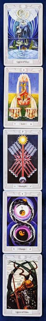 My Sun is in the first decan of Cancer, represented by the 2 of Cups (Love) under the umbrella of the Queen of Cups (Water of Water), while my Moon is in the first decan of Capricorn, reflected in the 2 of Disks (Change) surmounted by the Queen of Disks (Water of Earth). Below is a graphic display of their alignment; I placed the 9 of Wands between them to convey the idea of a covenant of strength linking the pairs. The Water cards occupy the solar end of the array while the Earth cards sit at the lunar end. (All images are copyright of US Games Systems Inc, Stamford, CT.)