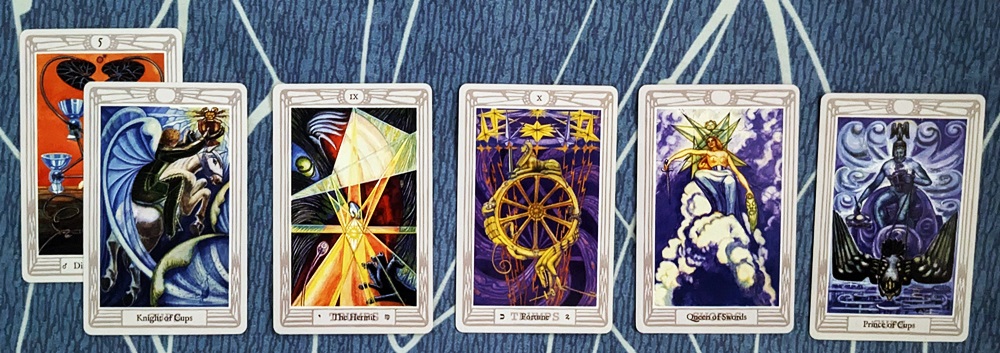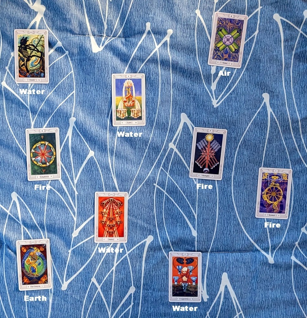 In the example reading below I came up with four Water cards, three Fire cards, one Air card and one Earth card before the necessary quota was reached. For simplicity of illustration, I didn’t use reversals in any of these steps. Although the elemental “zones” have no significance to the reading, it’s interesting that Water and Fire form a crooked central cross while Air and Earth are outliers. (All cards are from the Thoth Tarot, copyright of US Games Systems, Inc, Stamford, CT.)