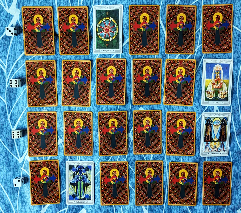 The first step is to shuffle a full tarot deck while concentrating on the question or topic of interest and deal four rows of six cards from left-to-right, face-down as shown below. (You may use reversals if you like, but I didn’t in the sample reading.) All cards are from the Thoth Tarot (Retro-Thoth version); card faces are copyright of US Games Systems Inc, Stamford, CT.