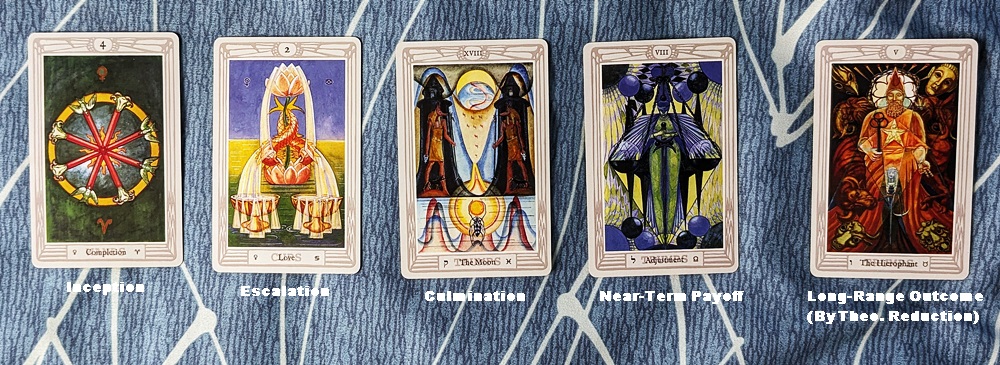 In the first version, where the Long-Range Outcome was obtained by “casting out nines” (32-9=23; 23-9=14), the 4 of Wands (Completion) suggests that “the fix is in” for opening a new chapter in the situation and the 2 of Cups (Love) implies emotional enthusiasm and gratification; however, the Moon injects ominous foreboding into the matter; the Near-Term Payoff card (Adjustment/Justice) indicates a need for judicious caution if choosing to move forward in the face of such dire misgivings; and the Long-Range Outcome card (Art/Temperance) confirms that great care will be required to achieve the desired result (my personal definition for this card is “consummate finesse,” and a friend of mine calls it the “walking a knife’s edge” card).