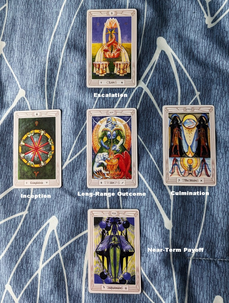 Two things to note about the calculation: 1) some practitioners don’t include the court cards because they bear no numbers, but I personally believe all of the cards on the table should be counted, so in the RWS deck I give them the numbers 11 (Page) through 14 (King), and the same for the Princesses through Knights of the Thoth deck; and 2) when using Theosophical addition you can never arrive at zero (the Fool in the modern tarot), so some diviners renumber the Fool as 22, a practice I don’t support; I “cast out nines” instead, which has the further advantage of offering more than one choice for the “quint.” (I either pick the one that best fits the overall narrative or – since they are “numerological counterparts” – I read both of them as indicating a complex scenario.)