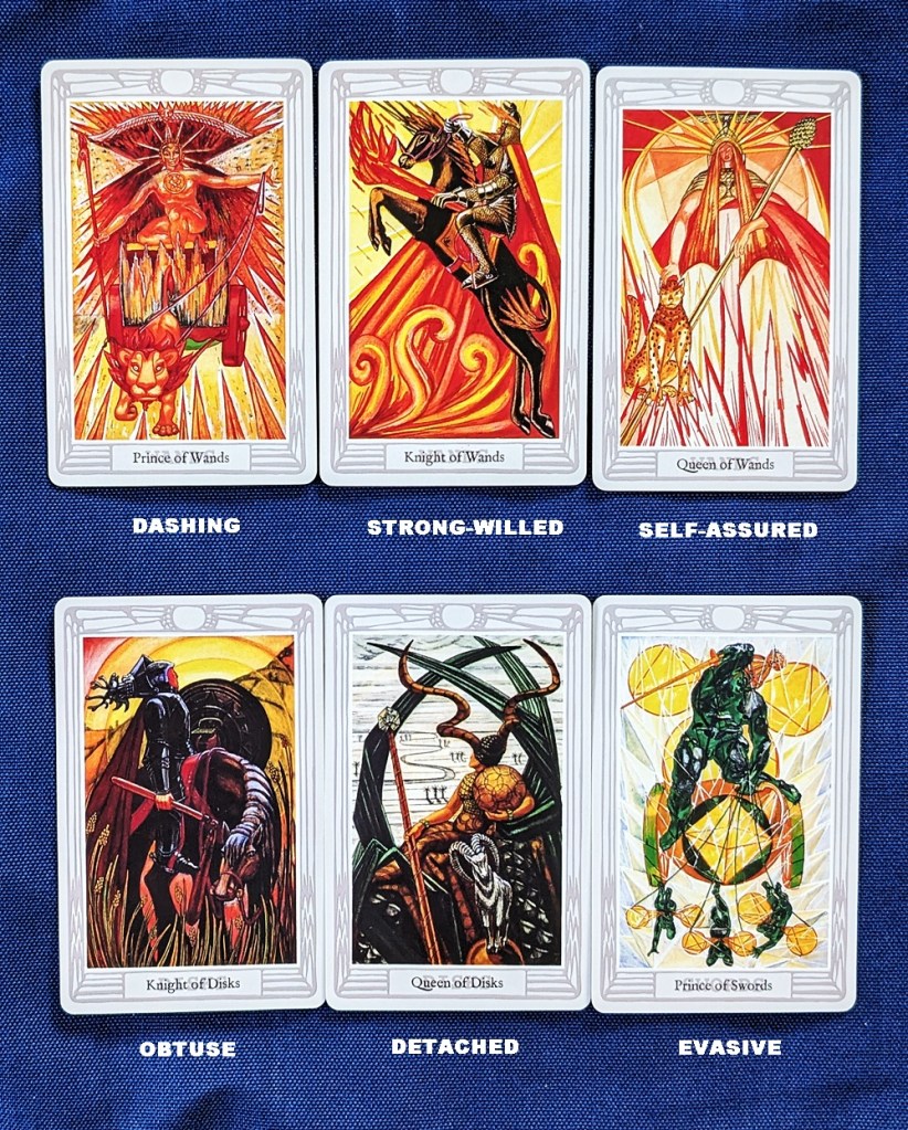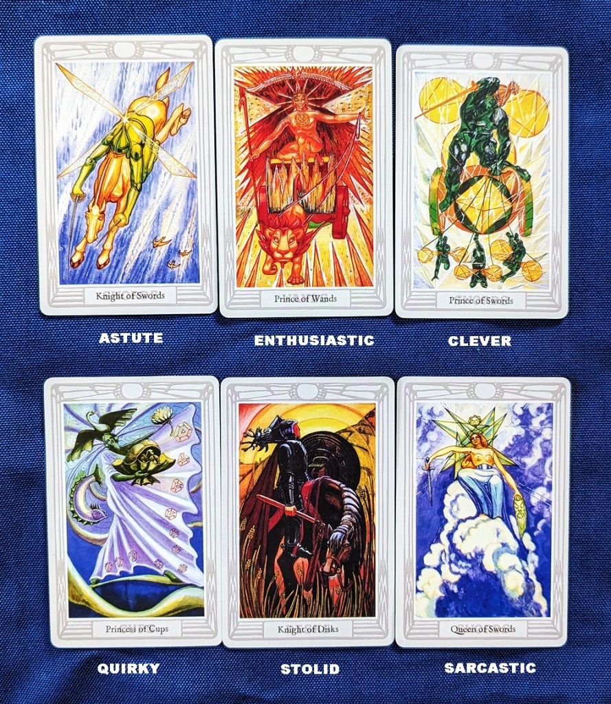 Then I separated the court cards from a tarot deck and selected the six that best fit my descriptors. I laid these in two rows, one above the other: a “hearts-and-flowers” self-congratulatory row and a “mean-and-nasty” uncomplimentary row.