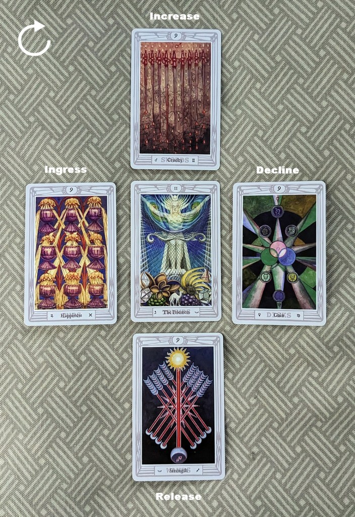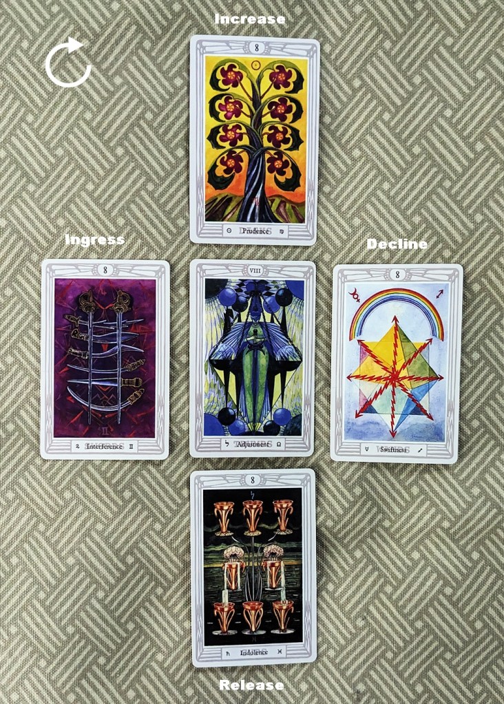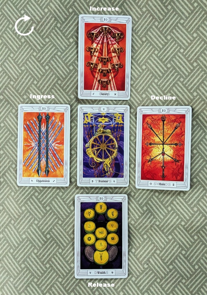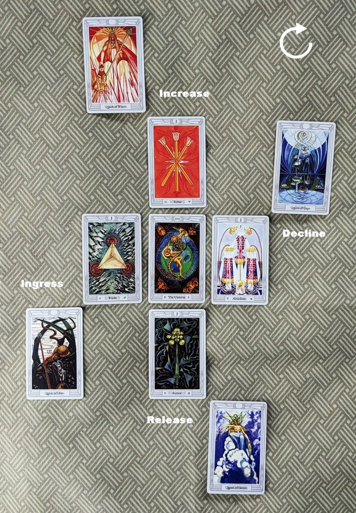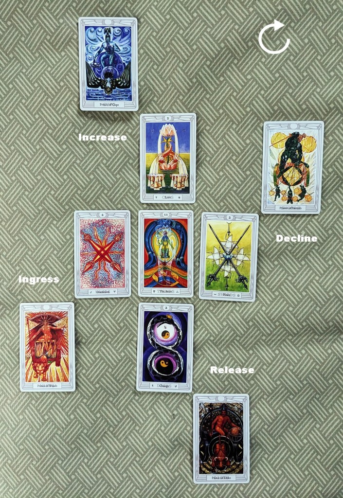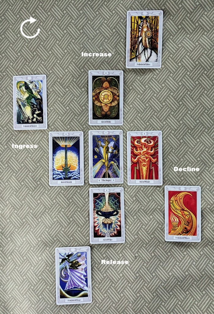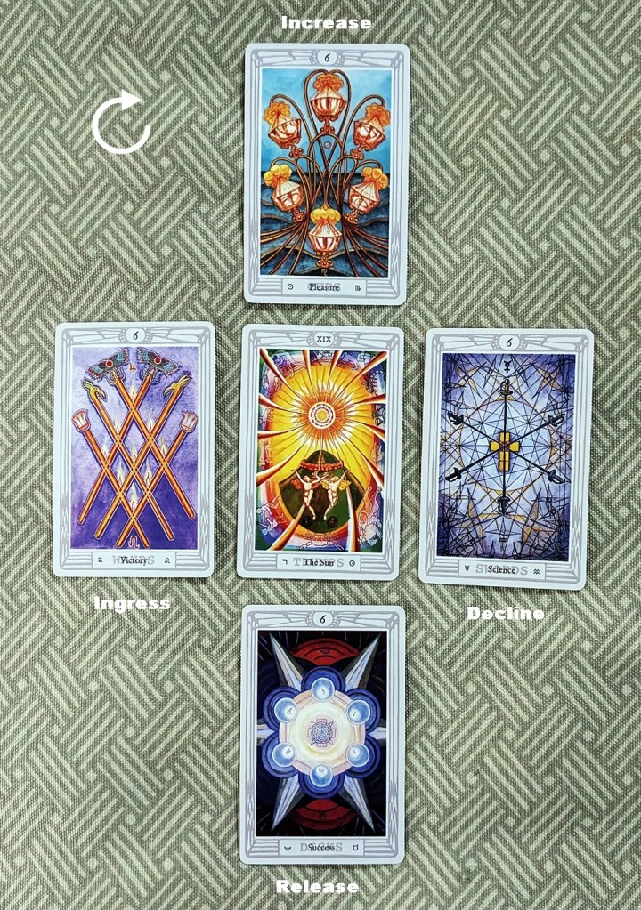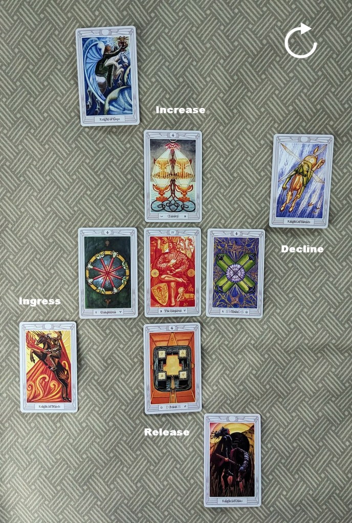 In each case, the trump card at the center of the array supplies the theme or environmental backdrop of the pattern. The clockwise movement of the surrounding cards emulates the diurnal motion of the Sun, with the matter in question growing in intensity from its Ingress (Dawn) through a culminating Increase (Noon) and a gradual tapering-off at its Decline (Sunset) to its enervated Release (Midnight). The theme card in each case “invites” the card (or if applicable, cards) matching its element to kick off development of the situation at the Ingress, and the sequence advances in the classical order of the elements (Fire-Water-Air-Earth).